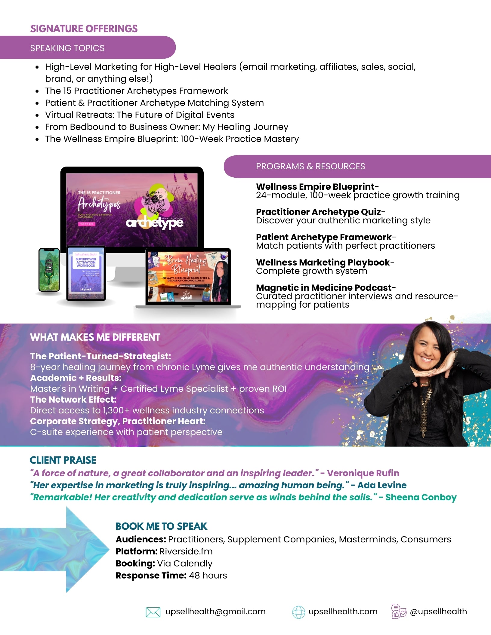 (Master’s degree in Writing from California College of the Arts; 11 years of industry-related experience; healed herself from chronic Lyme, heavy metals, and parasites so she understands your avatar)